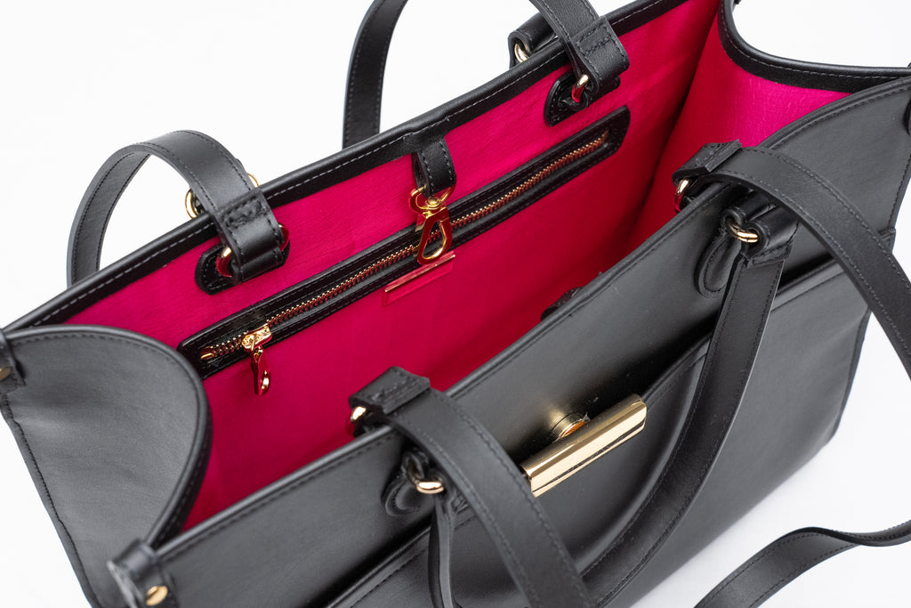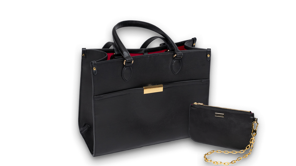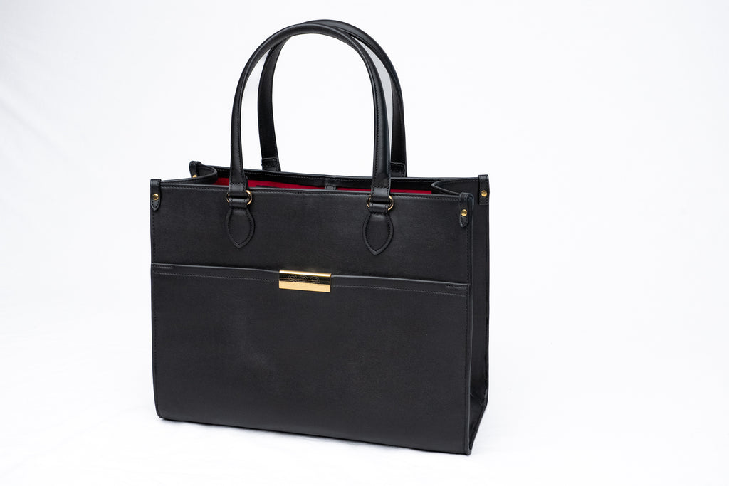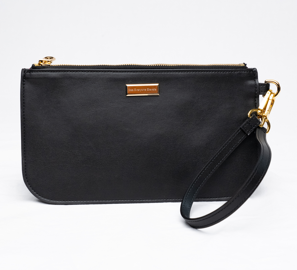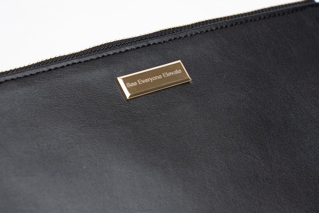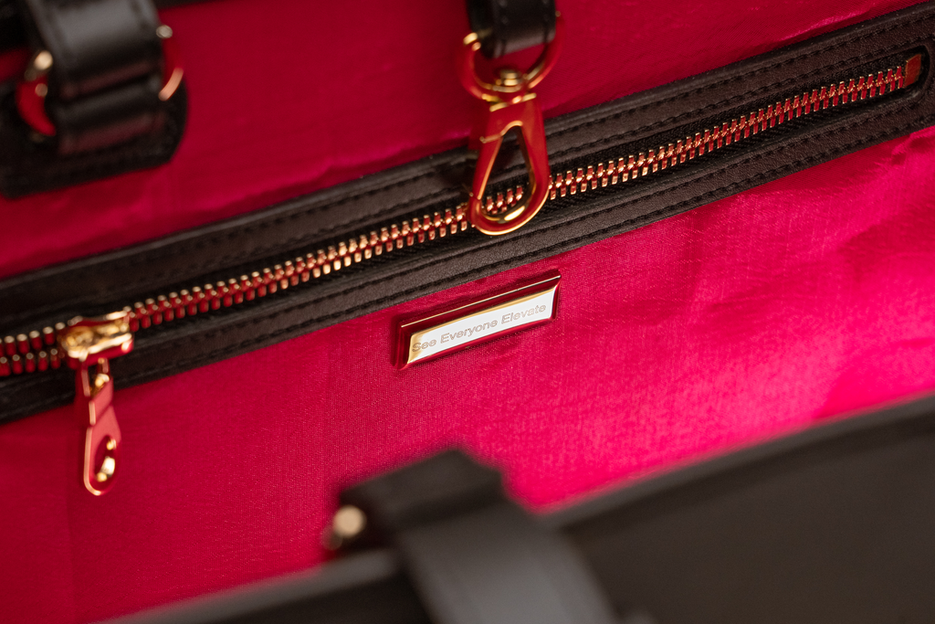 Crafted from premium vegan leather, this eco-friendly tote is individually handmade in the USA by a woman-owned business. Designed for style and function, it features sustainable stainless steel gold hardware with an engraved "SEE" outer label and an inspiring "See Everyone Elevate" message inside.